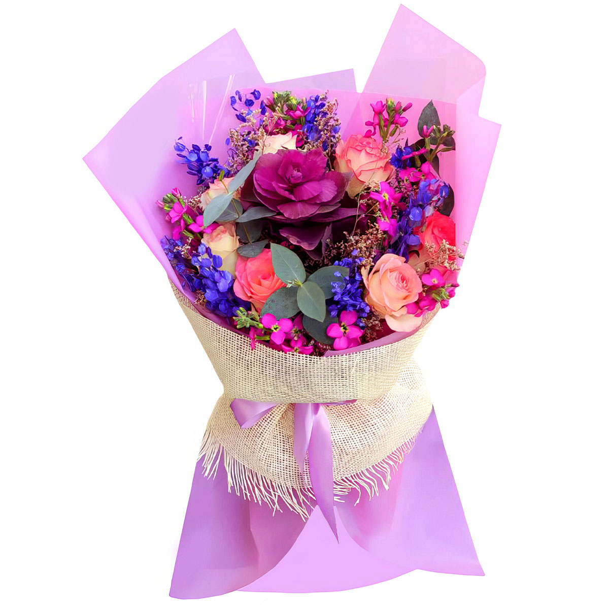 Брассика, роза одноголовая розовая, маттиола сиреневая, лунария синяя. Упаковка (лента, пленка, крафт, сетка, пленка матовая)