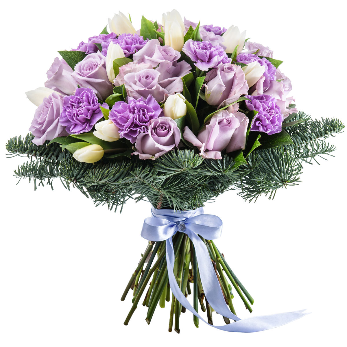 Роза одноголовая сиреневая, тюльпан белый, гвоздика сиреневая, пихта. Упаковка (лента, пленка, крафт, сетка, пленка матовая)