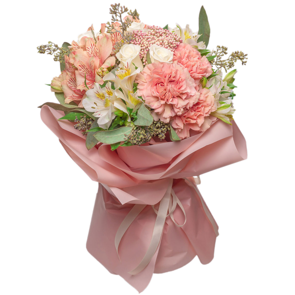 Альстромерия белая и розовая, гвоздика пионовидная розовая, озотамнус, роза белая, эвкалипт. Упаковка (лента, пленка, крафт, сетка, пленка матовая)