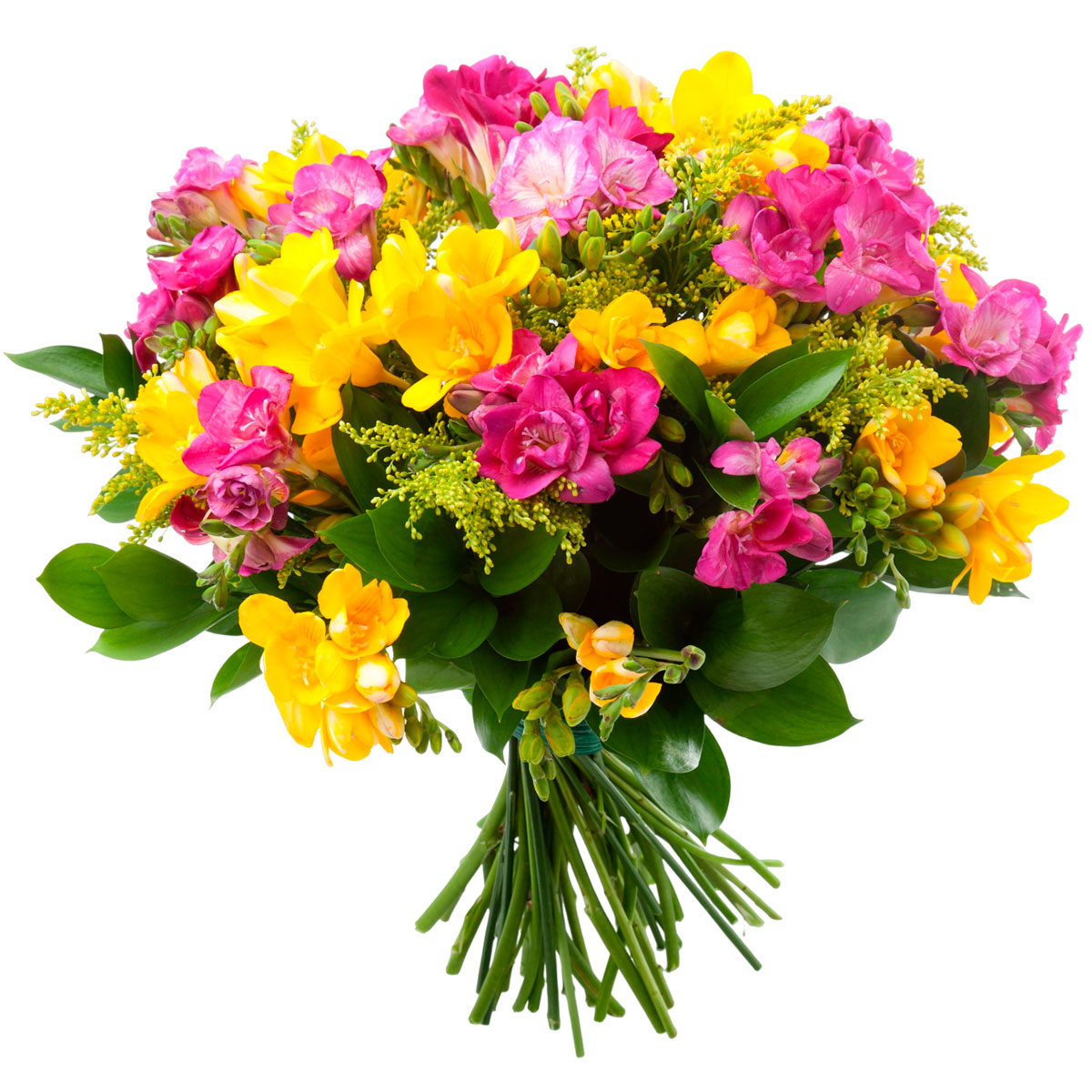 Фрезия желтая и розовая, солидаго, зелень. Упаковка (лента, пленка, крафт, сетка, пленка матовая)