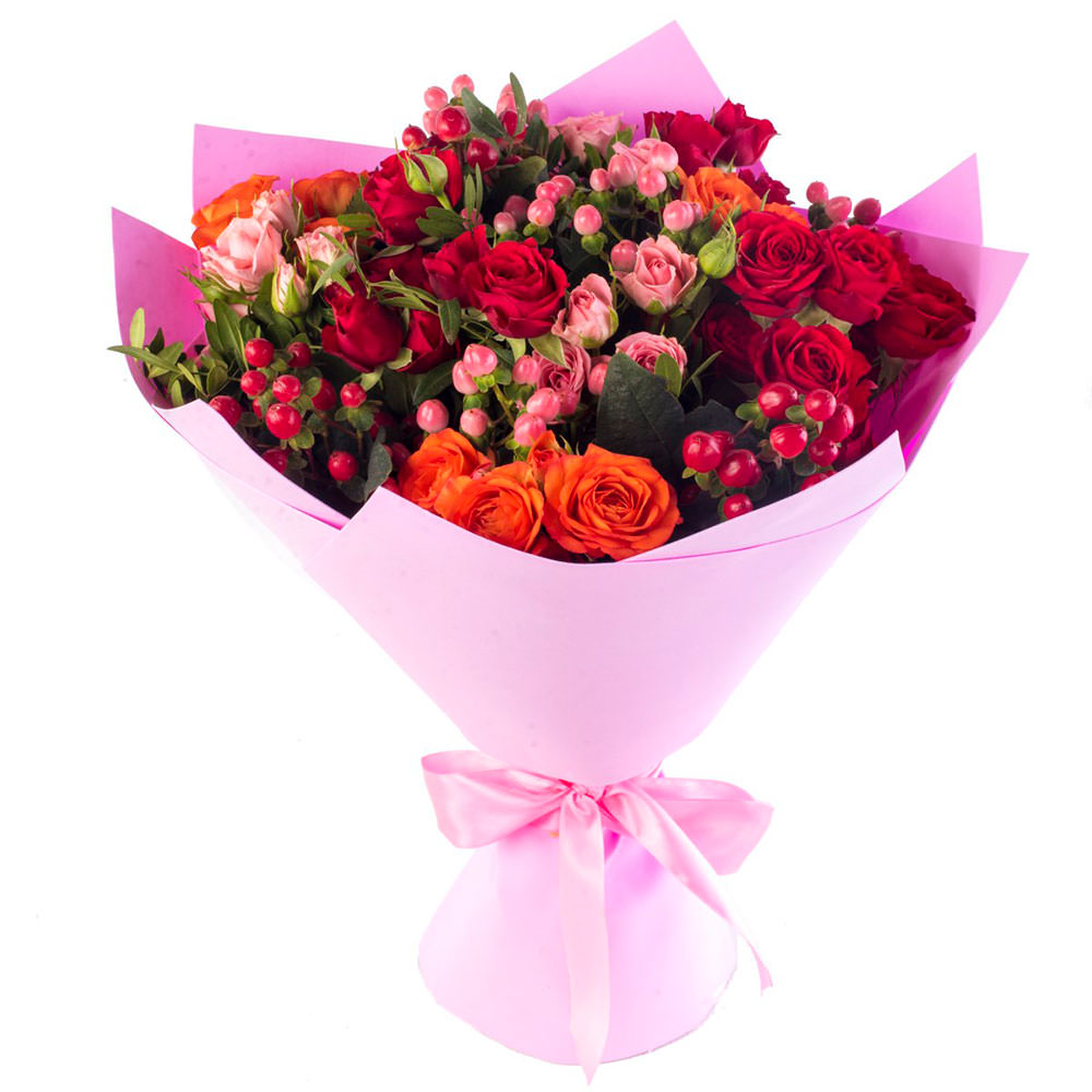 Роза кустовая микс (розовая, красная), гиперикум, зелень. Упаковка (лента, пленка, крафт, сетка, пленка матовая)