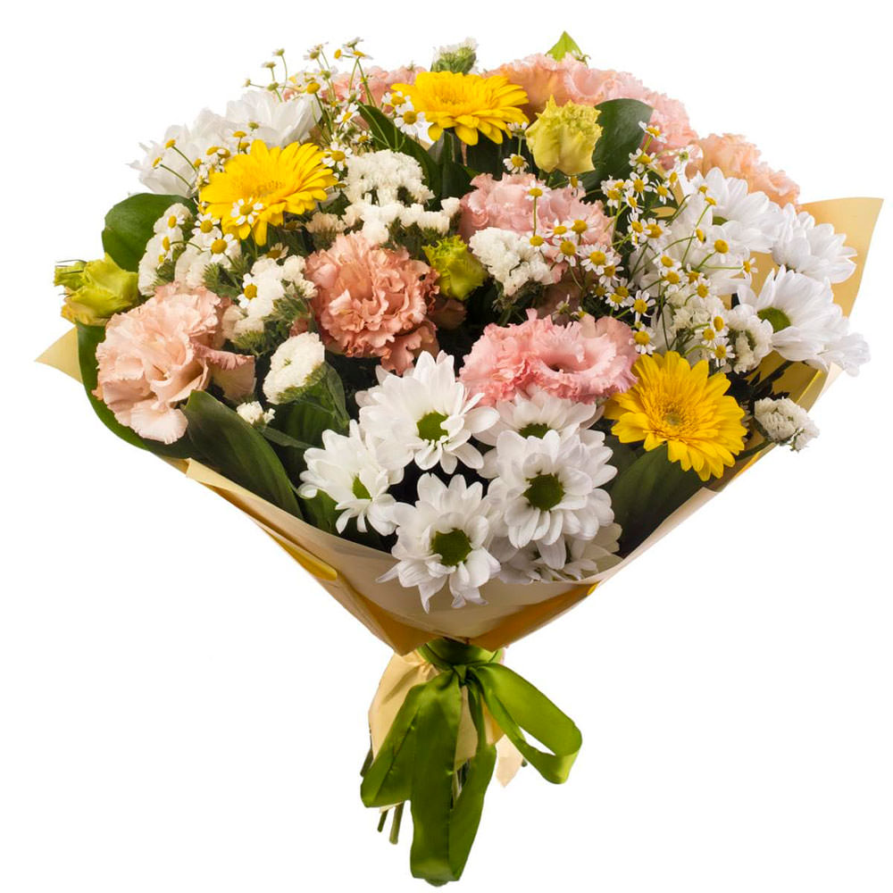 Хризантема кустовая белая, эустома розовая, гербера мини желтая, статица, ромашка, статица. Упаковка (лента, пленка, крафт, сетка, пленка матовая)