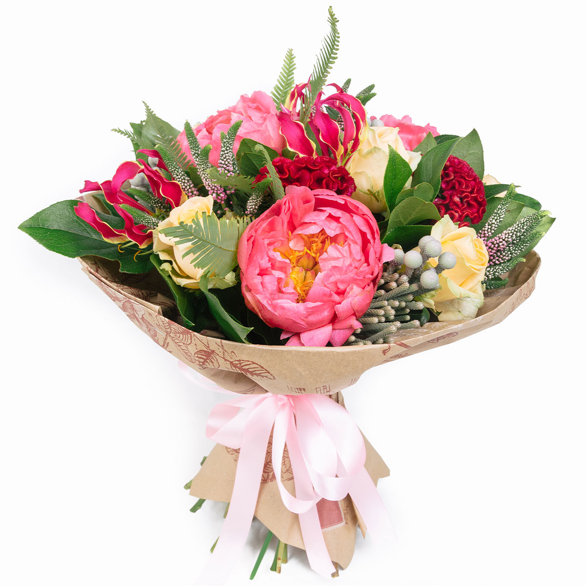 Пион коралловый, роза кустовая чайная, целозия гребенчатая, бруния, вероника, аспидистра. Упаковка (лента, пленка, крафт, сетка, пленка матовая)
