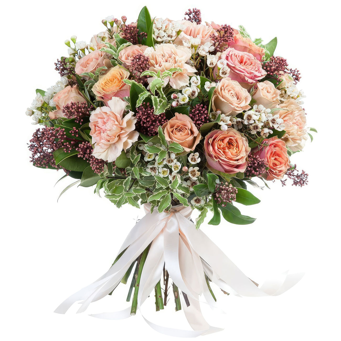 Ваксфлауэр, розы, скимия, озотамнус, зелень. Упаковка (лента, пленка, крафт, сетка, пленка матовая)