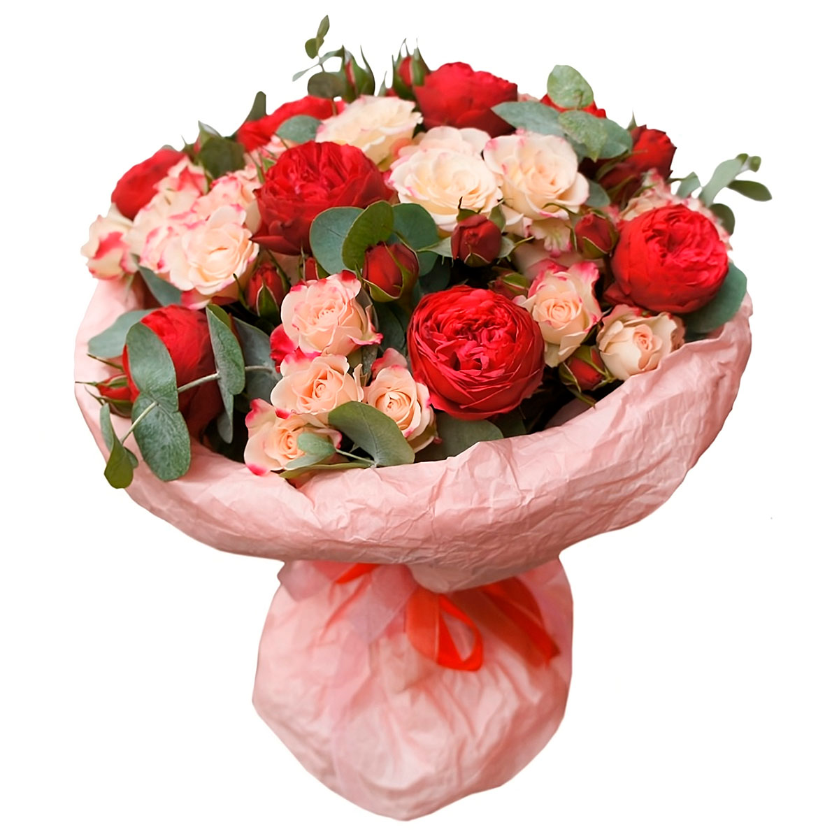 Роза кустовая кремовая, роза пионовидная красная, эвкалипт. Упаковка (лента, пленка, крафт, сетка, пленка матовая)