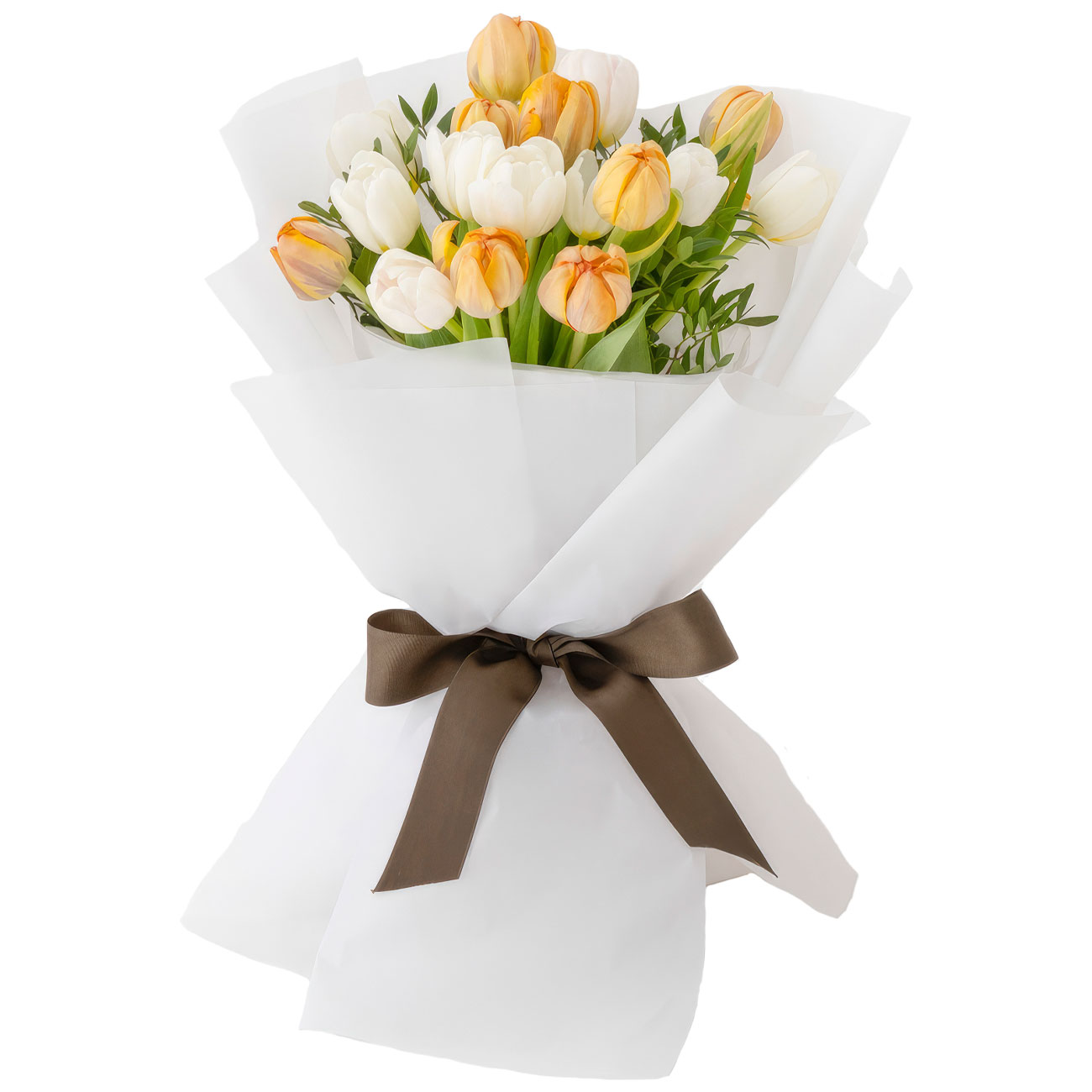 Тюльпан оранжевый и белый, зелень. Упаковка (лента, пленка, крафт, сетка, пленка матовая)
