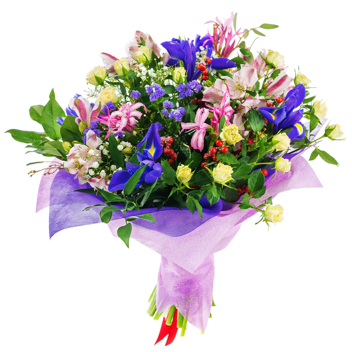 Ирис синий, роза кустовая желтая, альстромерия розовая, амарин розовый, гиперикум, гипсофила. Упаковка (лента, пленка, крафт, сетка, пленка матовая)