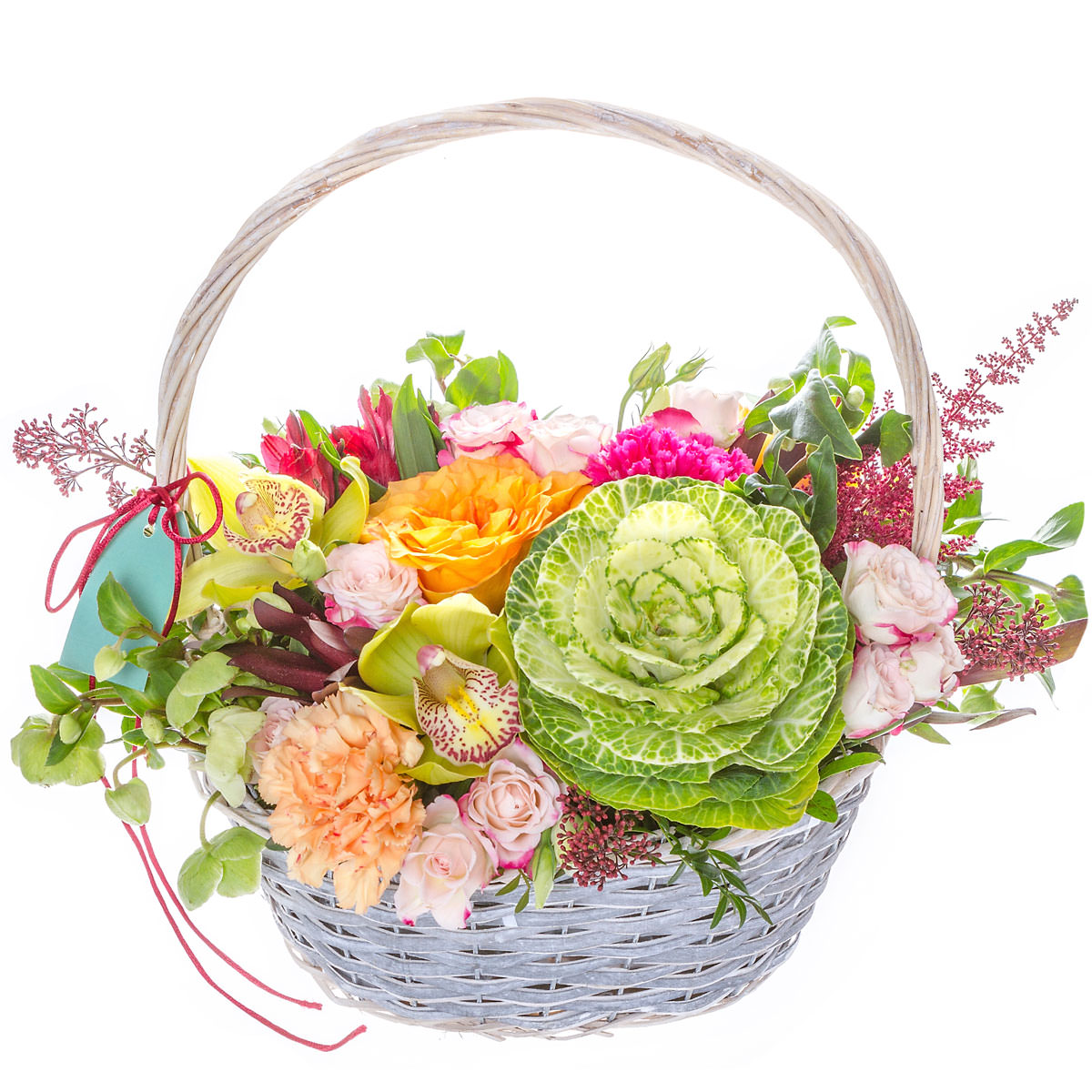 Орхидея желтая, роза одноголовая оранжевая, гвоздика персиковая, эустома розовая, протея, декоративная капуста, зелень. Упаковка (Корзина, оазис, ящик).