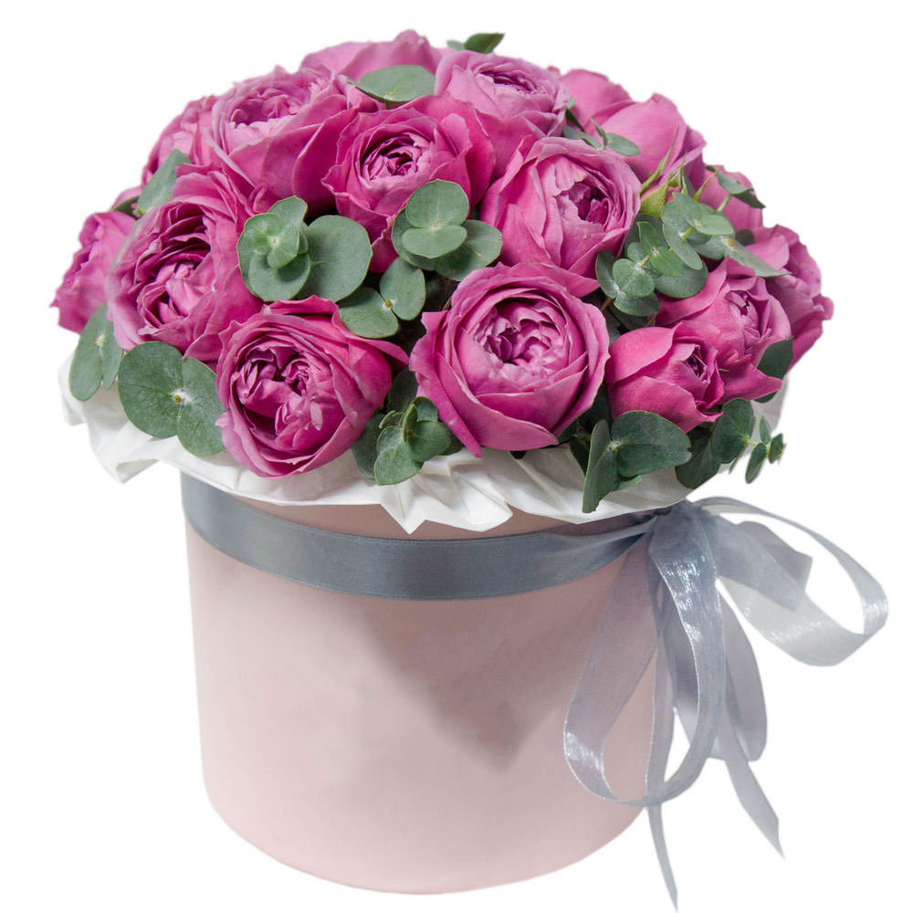 Роза пионовидная Misty bubbles, эвкалипт. Упаковка (шляпная коробка, квадратный бокс, коробка сердце, оазис)