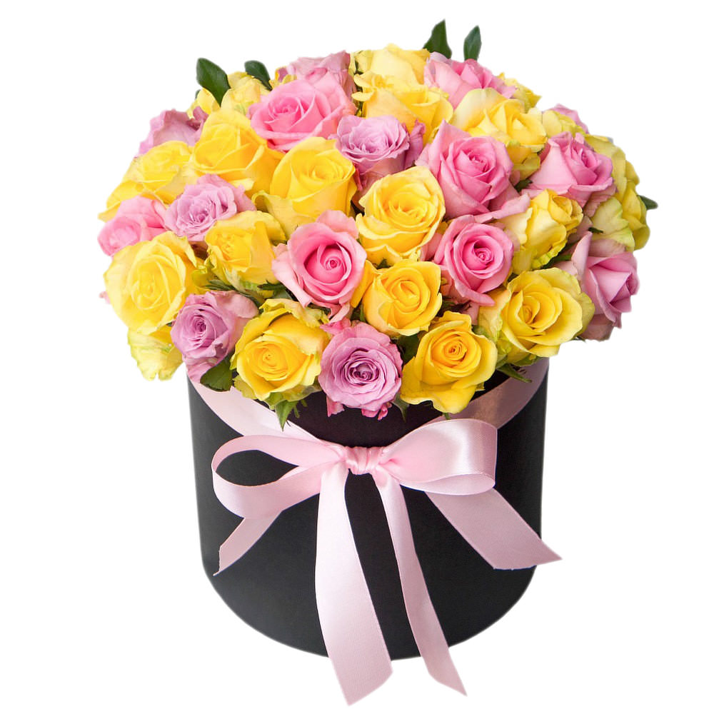 Роза одноголовая микс Россия (желтая, сиреневая, розовая). Упаковка (шляпная коробка, квадратный бокс, коробка сердце, оазис)